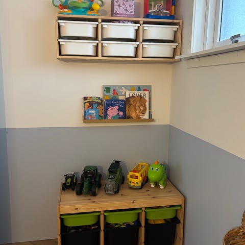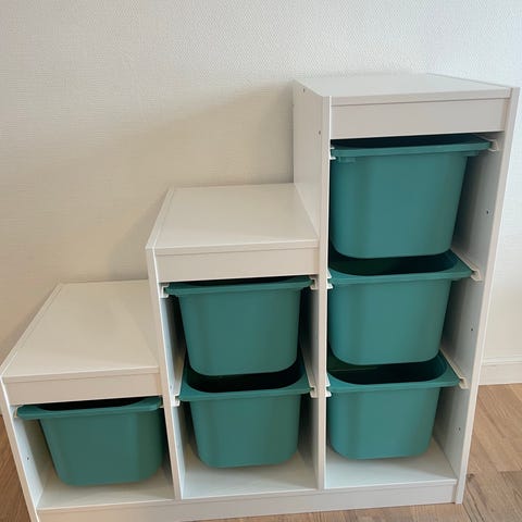 IKEA børnemøbel opbevaringsreol i træ med plastkasser. Reolen består af flere åbne rum, hvor der kan indsættes plastkasser i forskellige størrelser. Trækonstruktionen står direkte på gulvet og har en grøn plade på toppen, som kan bruges som bord- eller lejeoverflade. Plastkasserne er halvgennemsigtige, så indholdet kan ses. Velegnet til opbevaring af legetøj, kreative materialer eller andre børnesager i børneværelse eller legeområde.