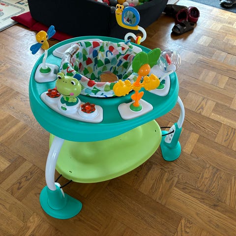 Bright Starts legetrampolinen har legetøj rundt i hele kanten, og sædet kan drejes 360°, så barnet kan lege med dem alle sammen. Fortil er der en sød frø, som siger sjove kvæklyde, spiller musik og blomsterne omkring den lyser. Hoppepladen kan sættes på 3 forskellige højder, og når barnet bliver ældre kan den fjernes helt, og så kan bordet bruges til opbevaring af legetøj. Der medfølger en smart opbevaringspose, som kan sættes ned hvor barnet tidligere har sat. Fortil er der også en praktisk tænd- og slukknap hvor det også er muligt at justere lydstyrken.