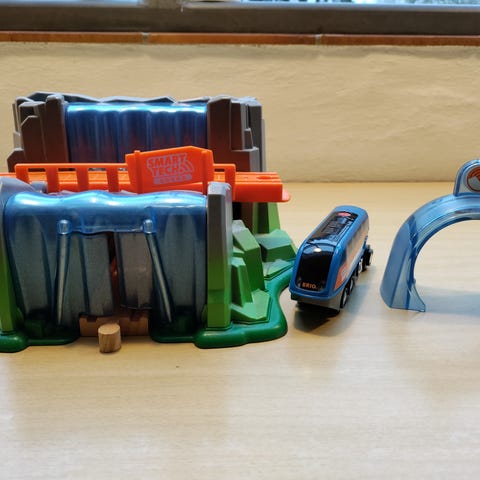 Denne artikel er et sæt af to plastiktunneler designet til legetøjstog. En tunnel er grå med små farverige blomsterdetaljer, mens den anden er grøn. Begge tunneler har buede åbninger, der muliggør passage af legetøjstog, og de kan måle ca. 18 cm i længden. passer til brio tog