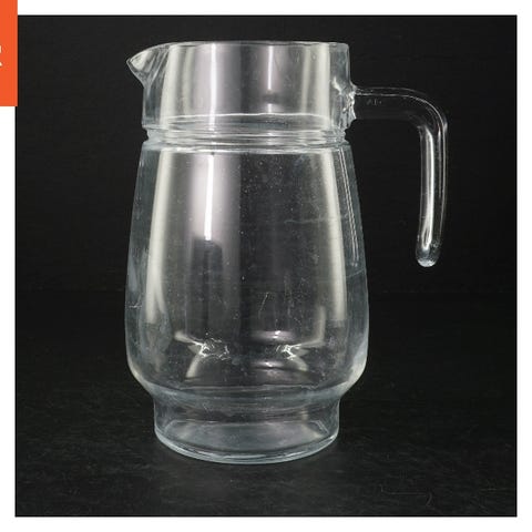 En gennemsigtig glaskande med hank, som måler 20 cm i højden. Kanden er cylindrisk og har en hældetud for nem udskænkning.