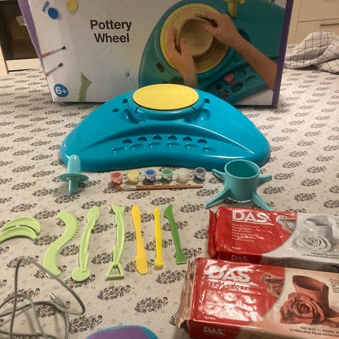 Drejeskive samt en masse tilbehør så man kan lave en masse krukker og potter i ler.