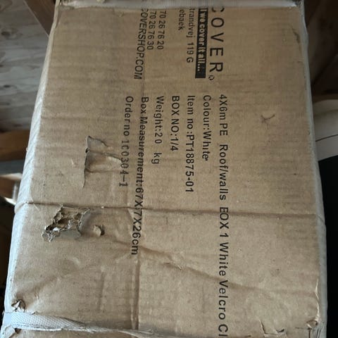 Teltet har været brugt 4 gange, og hver gang er telt dugene blevet rengjort, og har ligget inde i tør kælder. Så telt dugene fremstår som nye. Stængerne har stået i en aflukket garage, så der er nogle rustpletter på dem. Jeg har fået lavet en kæde med rigtige pærer som passer til teltet. Den kan tilkøbes for kr. 1.000.