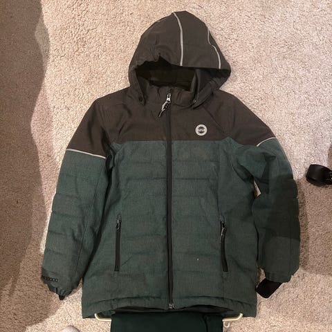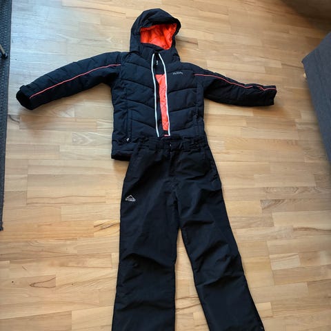 Jakken er str 134, og bukserne str 122. For vores datter passede de to størrelser godt sammen:)