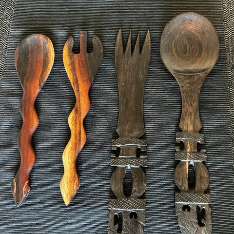 Bestik, Træ, Træ ske og gaffel ca 70cm lange udskåret
