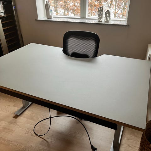 Flot hvidt hæve/sænke skrivebord. Med udtræksskuffe og linak aktuatorer. Mål 160x80 cm