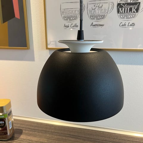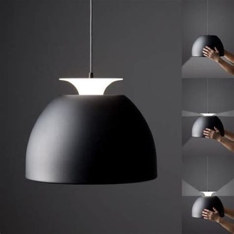 Særlig funktion: Lampens top kan åbnes/lukkes i toppen ved et let træk i skærmen og derved kan man justere balancen mellem direkte lys ned på bordet og indirekte, lys opad i rummet