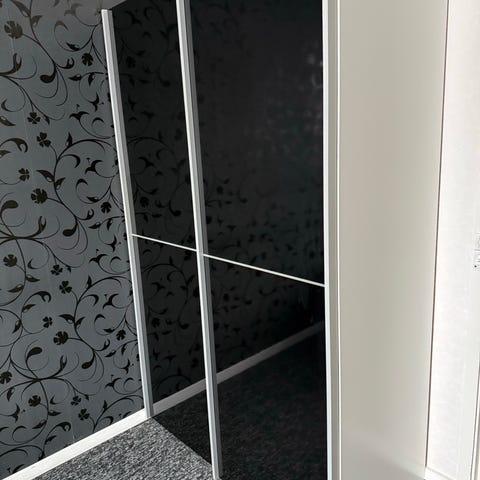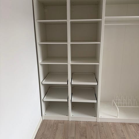 Rigtig fint garderobeskab med både hylder, store rulle skuffer i bunden og plads til bøjler