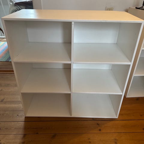 Hvide reoler der har været brugt i showroom.
