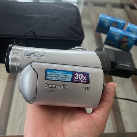 Medion MD 41559 digitalt videokamera i sølvfarvet kabinet. Kameraet er et Mini DV camcorder med digital videofunktion og udklappelig LCD-skærm. Det har forskellige betjeningsknapper på siden, håndrem til enhåndsbetjening samt tilslutningsmuligheder til digital overførsel (DV in/out). Velegnet til optagelse af video på Mini DV-bånd og efterfølgende redigering via computer. Taske mm medfølger .. se foto af samlet