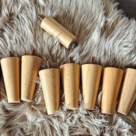 8 møbelben med standardskruer. 16 cm høje og i massivt træ. Kun brugt i få projektboliger til styling i få uger. Butikspris kr. 89,- pr. ben. Passer til langt de fleste senge, sofaer og lænestole.