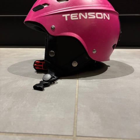 Farve: Pink/røde skibriller fra Tenson med rødligt glas og justerbar rem, der går rundt om hjelmen.