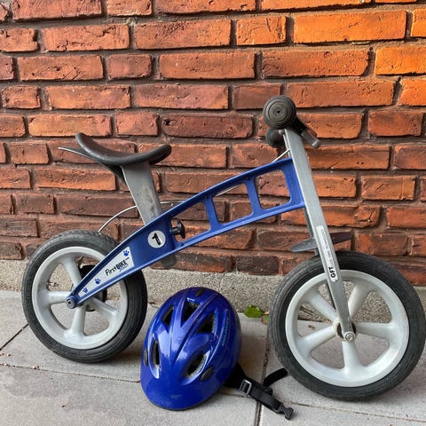 Helt genial løbecykel. Kan ikke ruste og vejer tæt på ingenting. Så den er nem, når man ofte ender med selv at bære den hjem 😁 rigtig god stand - ringeklokken kan pilles af.