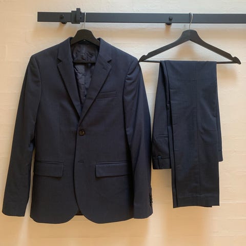 Vores søns konfirmations jakkesæt i marineblåt. Hvid skjorte og blåt slips.