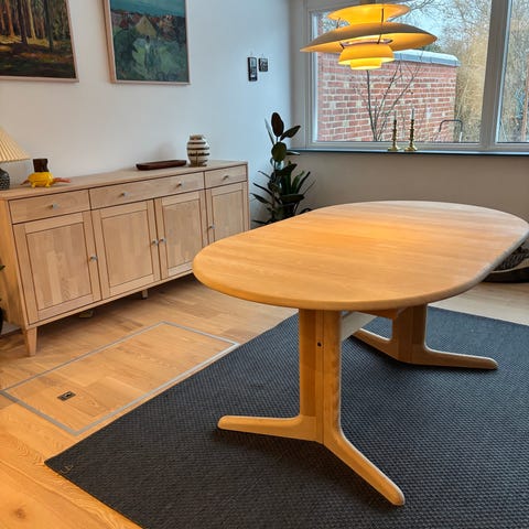 Fuldt udtrukket kan man sidde 12 omkring bordet idet bordpladen er bådformet