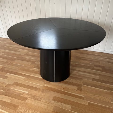 Hollandsk udtræk med to tillægsplader gemt under bordpladen. Tillægsplader er finér.