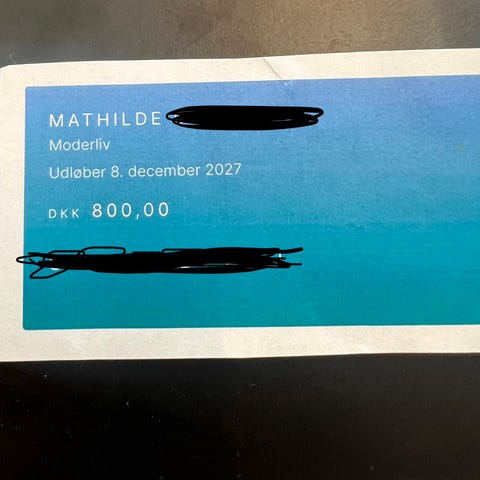 Sælger et gavekort til ‘Moderliv’ af værdi 780 kr. Skal bruges inden 30. Januar 2028.