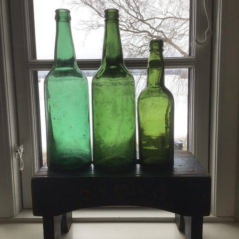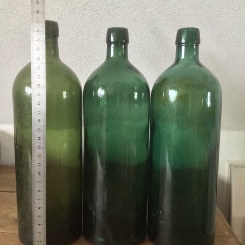 Sæt med 3 grønne glasflasker. Flaskerne er i forskellige højder, som ses på billedet med lineal. De har rund bund og forholdsvis smal hals. Velegnet til opbevaring af væske eller som dekoration, f.eks. i vindueskarm eller på hylde. Sælges samlet som sæt., prisen er for alle tre. Den lille har lidt mikro nips i kanten se foto. Sender gerne på købers regning