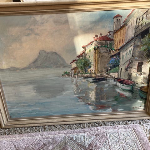 Maleriet er indrammet i en enkel, profileret ramme. Velegnet som vægdekoration i stue, gang eller sommerhus med maritimt tema.