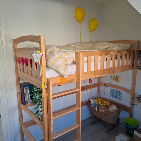 Der er desværre nogle små huller i det ene øverste gardin og det ene nederste gardin. Kan måske repareres ved at sy eller måske lime dem sammen?! Man lægger ikke mærke til dem umiddelbart. Alle gardiner kan bindes sammen. Man kan kan også samle sengen uden rutsjebane.