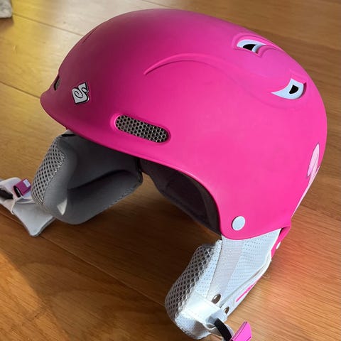 Outtrek skihjelm i størrelse S i to farver: én sort og én hvid med snefnugmønster. Begge hjelme har justerbar rem under hagen og ventilationsåbninger på toppen. Velegnet som beskyttelseshjelm til ski og snowboard. Yderskallen er hård plast med integreret holder bagpå, fx til skibrille-rem.
