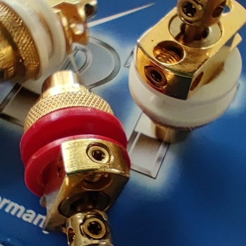 Ægte og originale WBT (World Best Terminal) højtaler terminaler, 2 sæt (= 4 rød og 4 hvide) på plast monterings rundel sælges til 1/3-del af nyprisen (3.000 kr for 2 hvide og 2 røde)...! Det bedste når du skal lave gode forbindelser mellem højtaler og forstærkerkabler!