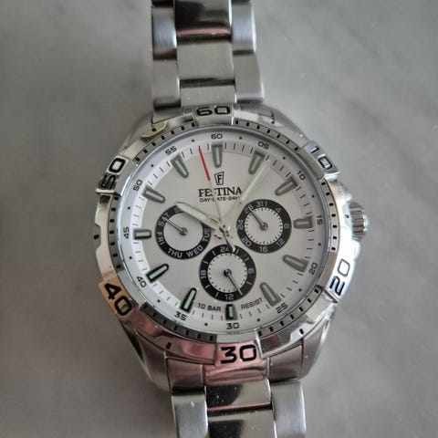 Festina F20465/2 herreur med kronograf i rustfrit stål med blå urskive. Uret har rund urkasse, drejelig lynette med minutmarkeringer og tre små kronografskiver på skiven. Lænken er i rustfrit stål med foldelås. Quartz-værk (batteridrevet). Uret leveres i original Festina-æske, som kan bruges til opbevaring. Velegnet som herreur til daglig brug. Helt nyt ur modtaget i julegave fra arbejde. Der er fuld garantibevis ved at scanne stregkode på boksen. Billigste pris på nettet er 795 kr. Normal pris 1.000 kr.