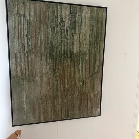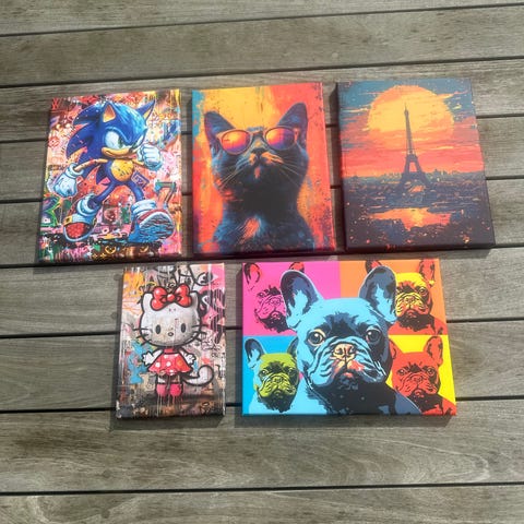 Billederne har dominerende farver i gul, rød, sort og grønne nuancer. Motiverne inkluderer kalligrafi-lignende skrifttegn og figurative elementer. Hvert billede er monteret på en hård plade med ophæng på bagsiden, klar til at blive hængt op på væggen. Velegnet som dekoration i stue, gang eller andre opholdsrum.