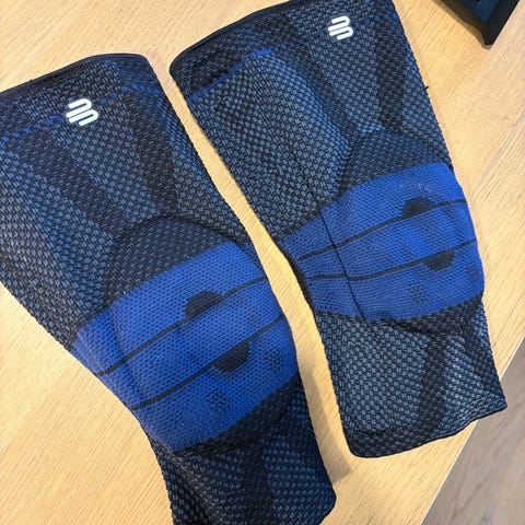 Rehband 7442 knæbind i størrelse XL. Knæbindene er blå med sorte og hvide detaljer og har polstret front. Egnede til støtte og stabilisering af knæet ved sport og træning. Sælges som sæt med to stk.