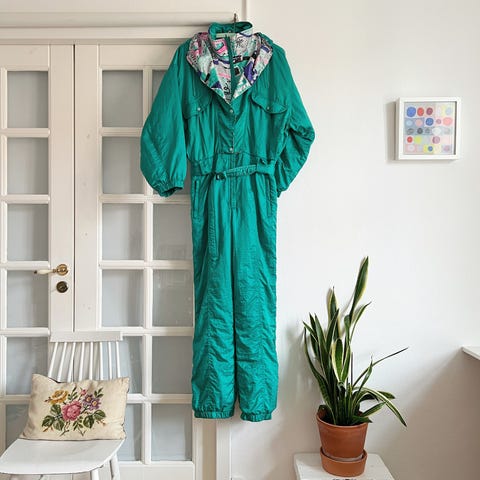 Beautiful unique vintage ski suit in great condition. Rare, never seen anywhere, this winter season you must have it! Made out of very comfortable, strong material. Zipped fastening, 2 outer pockets, elastic waist, high collar, perfect both for skiing or for casual wear. Zip pockets on sides.