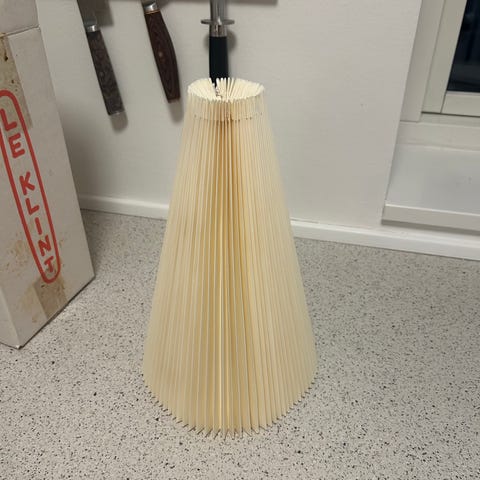 Le Klint lampeskærm formoder det er model 6 med en diameter i bunden på ca. 29 cm inklusiv ophæng til alle 3.