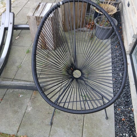 Rund stol med sort snor-sæde og metalben. Sædet er opbygget af spændte snore i et cirkulært mønster med åbning i midten, og stolen står på tre slanke ben. Velegnet som loungestol i stue, værelse eller udestue.