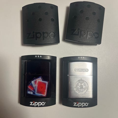 Zippo lighter sæt med tilbehør. Sættet indeholder en Zippo lightervæske, en pakke vat, en beholder med ekstra flintsten samt mindst to metal-lightere. En slebet ned til metallet, en anden Budweiser. en aLeveres i original Zippo-æske. 400kr