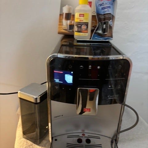 Melitta Caffeo Barista Smart S espressomaskine i sort. Fuldt automatisk kaffemaskine til hele bønner med integreret kværn og mælkebeholder med slange til mælkeskum. Frontbetjening med touchpanel og display, hvor der kan vælges forskellige kaffedrikke som espresso, kaffe og mælkebaserede drikke, og maskinen kan styres via app. Maskinen har rense- og afkalkningsprogrammer, som vises i menuen på displayet. Separat aftagelig vandtank og aftagelig mælkebeholder for nem rengøring. Maskinen har altid kørt med vandfilter, og er altid blevet renset og vedligeholdt. Maskinen er ca 4 år gammel, og virker perfekt.
