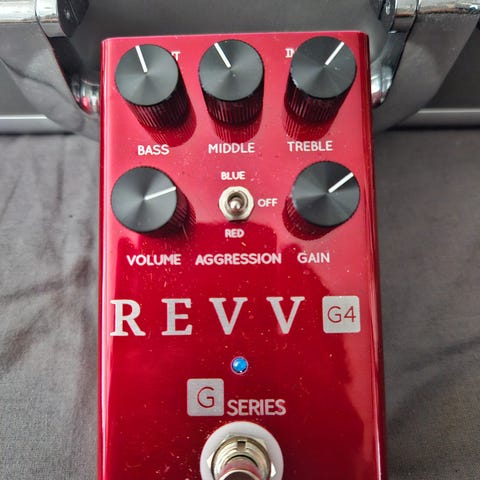 REVV G3 forvrængningspedal. Kontroller for Bas, Mellem, Diskant, Lydstyrke, Aggression og Gain. Fremstillet i Canada.
