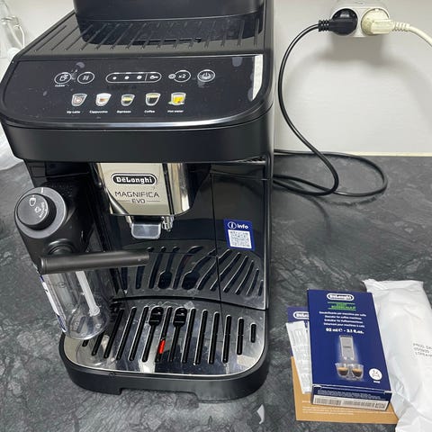De'Longhi Magnifica Evo espressomaskine i sort. Fuldt automatisk kaffemaskine med indbygget kværn og frontbetjening via touchknapper til forskellige kaffedrikke. Udstyret med justerbart damprør til mælkeskum samt aftagelig vandtank og drypbakke for nem rengøring. Maskinen er egnet til brygning af espresso og andre kaffedrikke i hjemmet. På billederne ses også original emballage og tilbehør, herunder vandfilter.