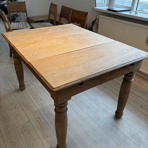 Spisebord med 6 stole – én stol er lidt løs, og en er anderledes/større end de andre