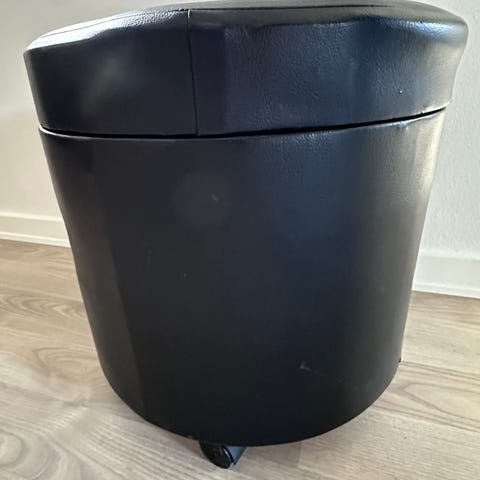 Jysk puf med opbevaring i sort kunstlæder. Rund model med aftageligt låg, der giver adgang til opbevaringsrum indeni. Overfladen er polstret og betrukket med kunstlæder med syninger og knapdetalje på toppen. Undersiden har fødder, som beskytter gulvet. Velegnet som ekstra siddeplads, fodskammel eller opbevaringsløsning i stue, soveværelse eller entré.