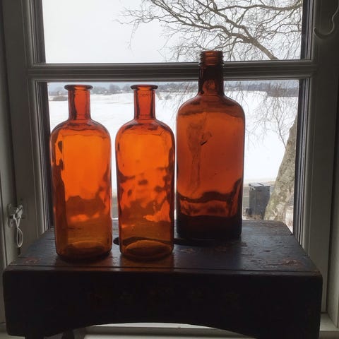 Smukke glasflasker i grøn brunligt glas. Sættet består af tre flasker i forskellige størrelser og former, herunder en rillet flaske og to glatte flasker. Alle tre flasker har præget mønster. Flaskerne er fremstillet i farvet glas og kan anvendes som dekorative elementer, til opbevaring eller som vaser. Bundene viser præget tekst og mønstre. Sælges samlet og prisen er for alle 3. Sender gerne på købers regning.