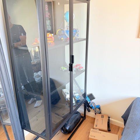 IKEA skab i sort. Glas hylder og lys.