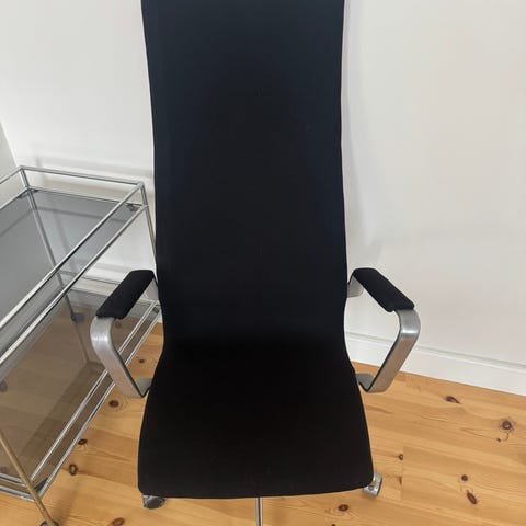 Arne Jacobsen. Oxford kontorstol / armstol med armlæn og fempas stjernefod af aluminium, betrukket med blåt uld, armlæn betrukket med sort læder. Formgivet 1965. Fremstillet hos Fritz Hansen, model 3291. Fremstår meget pæn med almindelige brugsspor.
