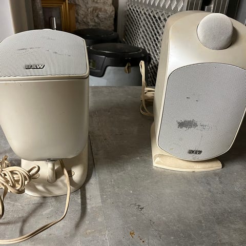 En stilren B&W-klassiker, der stadig spiller markant bedre end de fleste moderne plastik-højttalere. 🎶