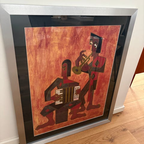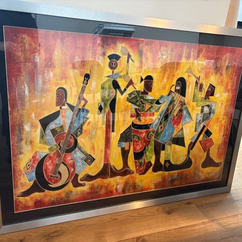 Lime Concert med ramme i størrelse 77 x 97 cm. Motivet viser et farverigt, stiliseret musikscene i grønne, gule og brune nuancer. Maleriet er indrammet i en alu BO-ramme med glasfront. Alle 3 malerier 4500kr.