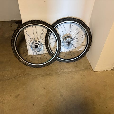 Cykelhjul sæt med skivebremser i sort. Sættet består af to hjul med sorte fælge og eger. Begge hjul er udstyret med skivebremserotorer og reflekser monteret i egerne. Velegnet som reservedele eller udskiftning på cykel med skivebremser. Nærmere specifikationer som hjulstørrelse, navtype og akseltype fremgår ikke af billederne og bør kontrolleres ved interesse.