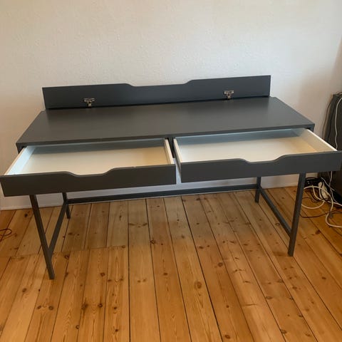 Skrivebord fra Ikea model Alex med to indbyggede skuffer og skjult kabelstyring. God plads til pc og 1-2 skærme. Farven er mørkegrå og bordet er i god stand.