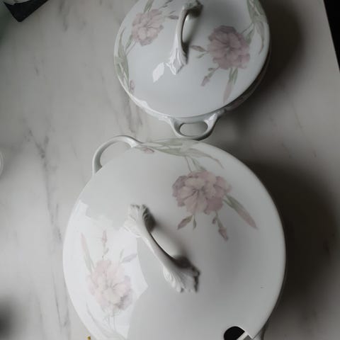 Rosenthal terrin med låg i porcelæn med blomstermotiv. Terrinen har to grønne hanker og matchende låg med knop formet som en blomst. Indvendigt er terrinen hvid, udvendigt dekoreret med blomster og grønne blade. Velegnet til servering af supper, gryderetter eller andre varme retter ved bordet.