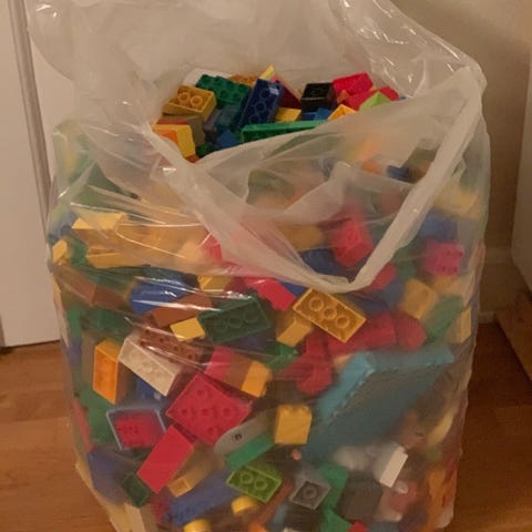 En 15 kg stor pose fyldt med blandet LEGO DUPLO. Der er til mange timers leg. Det medfølger 16 fine plader til at bygge med, som bare i sig selv koster 400 kr.