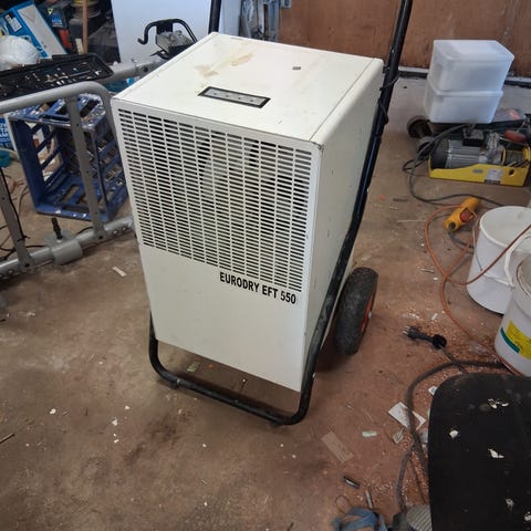 Malmbergs DH-400/A affugter. Velegnet til affugtning af indendørs rum som f.eks. kælder, bryggers eller andre områder med høj luftfugtighed. Mål (bxdxh): 35 x 17 x 50 cm. Tekniske data fremgår af typeskiltet på foto.