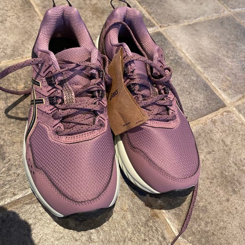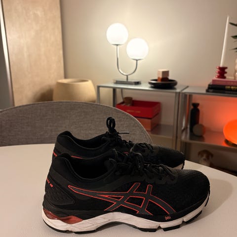 Asics Gel-Venture løbesko i størrelse 40. Modellen er i sort med kontrastdetaljer. Overdelen er i åndbart mesh med syntetiske forstærkninger for støtte omkring foden. Skoen har snørelukning, polstret hælkappe og tunge for øget komfort. Mellemsålen er konstrueret til løb og giver stødabsorbering, mens ydersålen har mønster, der giver greb på forskellige underlag. Velegnet til løb og anden træning.