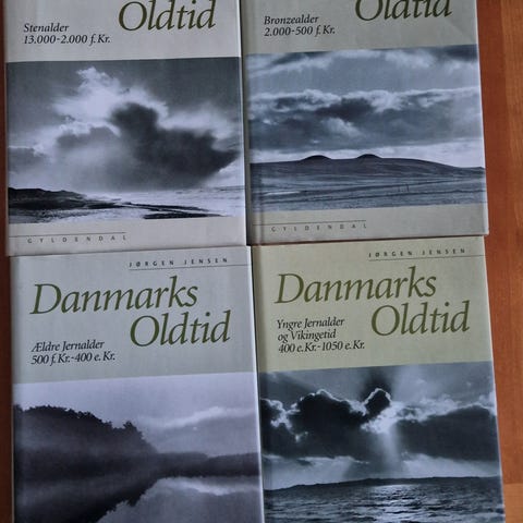 Johannes Brøndsted Danmarks oldtid bogsæt med tilhørende kort. Sættet omfatter flere bind om Danmarks forhistorie med illustrationer af arkæologiske fund på omslagene. Medfølgende stort, sammenfoldeligt kort over Danmark, der viser geografiske og historiske forhold. Velegnet som opslagsværk eller supplement til studier af dansk oldtid og arkæologi.