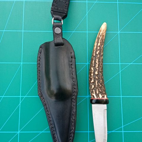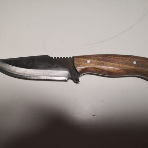 Kniv med mørkt træhåndtag og rustfrit stålblad med bølgemønster. Inkluderer en brun læderskede med trykknaplukning. Kniven har en metalring i håndtaget for bedre greb og håndtering.